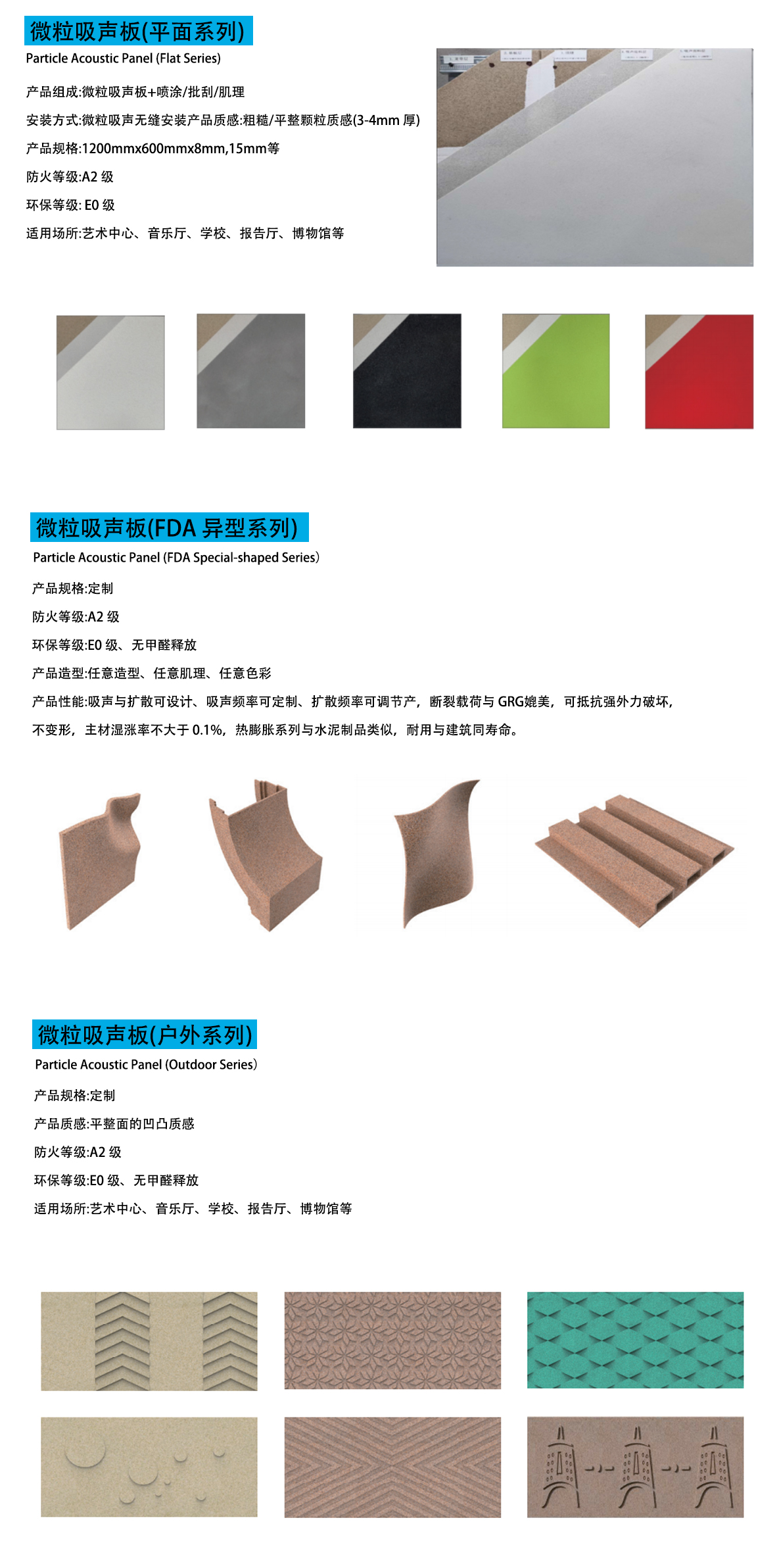 在该工艺中,微粒粒径级配比与聚合方式均可精确地调控,进而确定了内部孔洞的大小及排列方式,由此可以根据实际需求进行自定义设计并制作不同声学特性的吸声降噪产品。该工艺生产的产品强度可达0.7Mpa、防火A2级、产烟特性S1级,燃烧滴落微粒等级达d0级、防潮、抗冻、耐酸城、抗盐雾防腐蚀,耐老化,而且工艺中采用绿色胶凝材料,使得微粒产品无任何有害挥发物,是绿色环保的声学材料。
