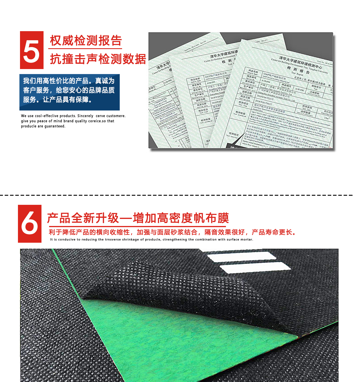 * 地砖地面应用将“聚氨酯隔声减震阻尼垫”铺垫于贴砖沙浆底部,水泥沙层厚度≥30mm。地面结构增加高度为材料厚度加上沙浆层厚度。