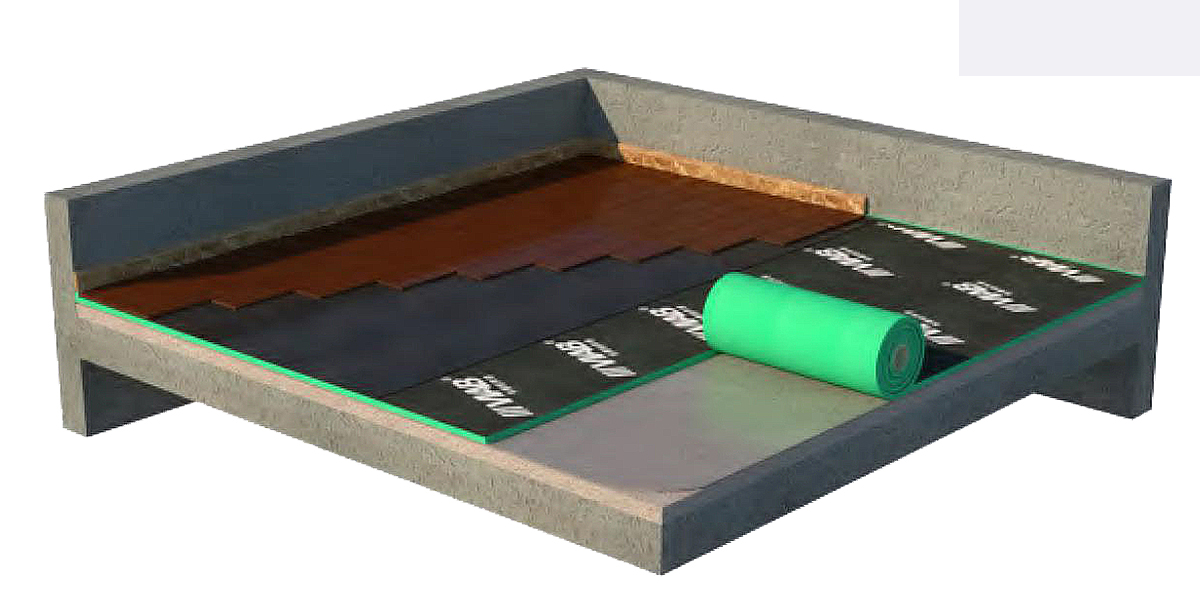 * 木地板地面应用将“聚氨酯隔声减震阻尼垫”铺垫于木地板底部。地面结构增加高度为材料厚度CDM-A15 1.5mm;
