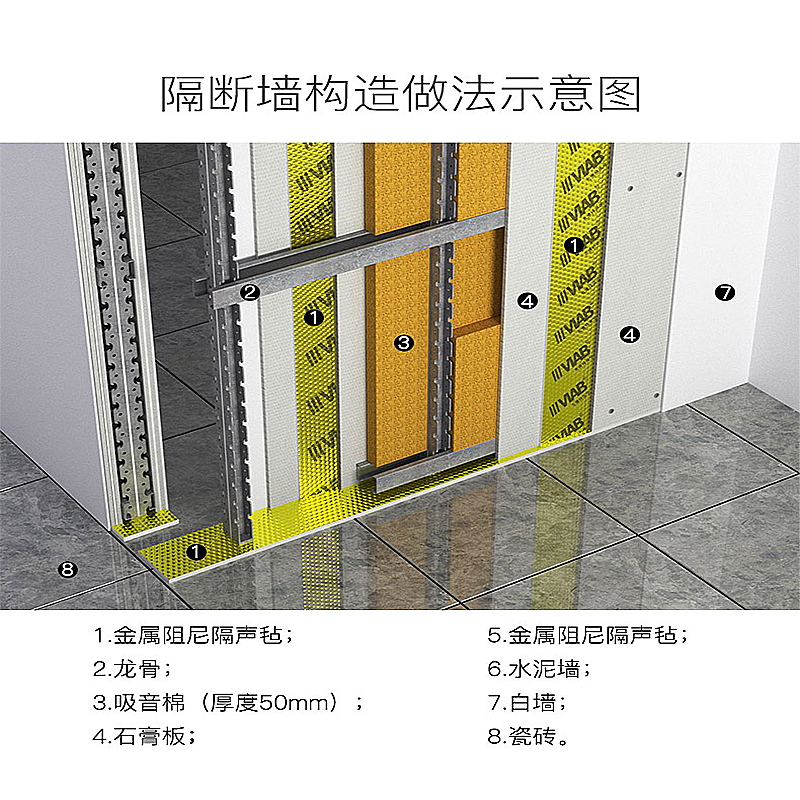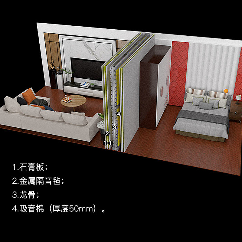 住宅、酒店、会所、会议室、办公隔断及保密区域内腔式轻质隔墙、天花板和地板的结构隔声量增强理想选择;