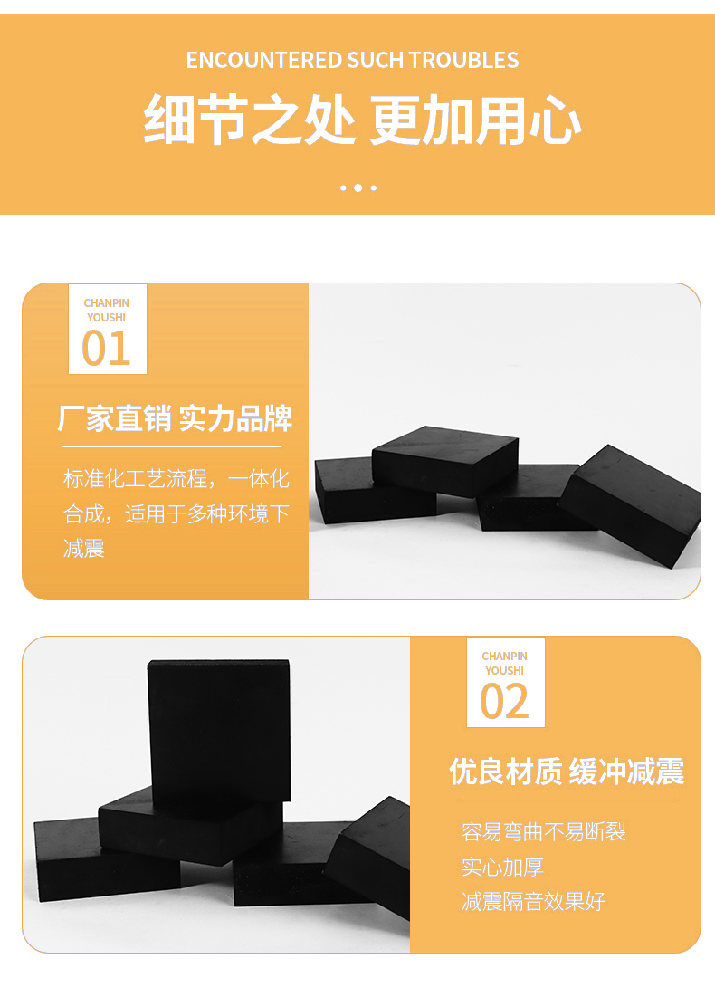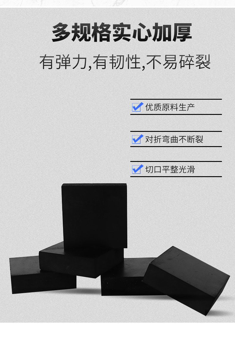●产品名称:橡胶块 ●产品颜色:黑色 ●产品尺寸:任意尺寸可定制 ●产品功能:减震 缓冲防滑等 ●应用场景:多场景应用 ●产品厚度:1mm-100mm ●产品材质:合成橡胶